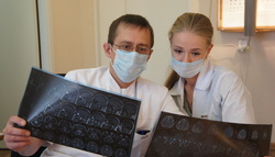 Тысячная совместная консультация нейрохирурга и эндокринолога прошла в поликлинике ГКБ 40. С 2015 года в больнице организован эксклюзивный для Урала прием, который ведут сразу два врача. Кстати, оба - кандидаты медицинских наук: заместитель главного врача ГКБ 40 по терапии Марина Кочергина и заведующий нейрохирургическим отделением № 1 Андрей Лазарев. Сфера их интереса - патология хиазмально-селлярной области - заболевание на стыке нескольких дисциплин. Новообразования в этой области мозга в 50-70% случаев приводят к нарушениям различной степени гормональных функций, а этим занимаются эндокринологи. Кроме того, всегда на связи с командой специалистов офтальмолог Елена Орлова, поскольку первым признаком болезни часто бывают зрительные нарушения.