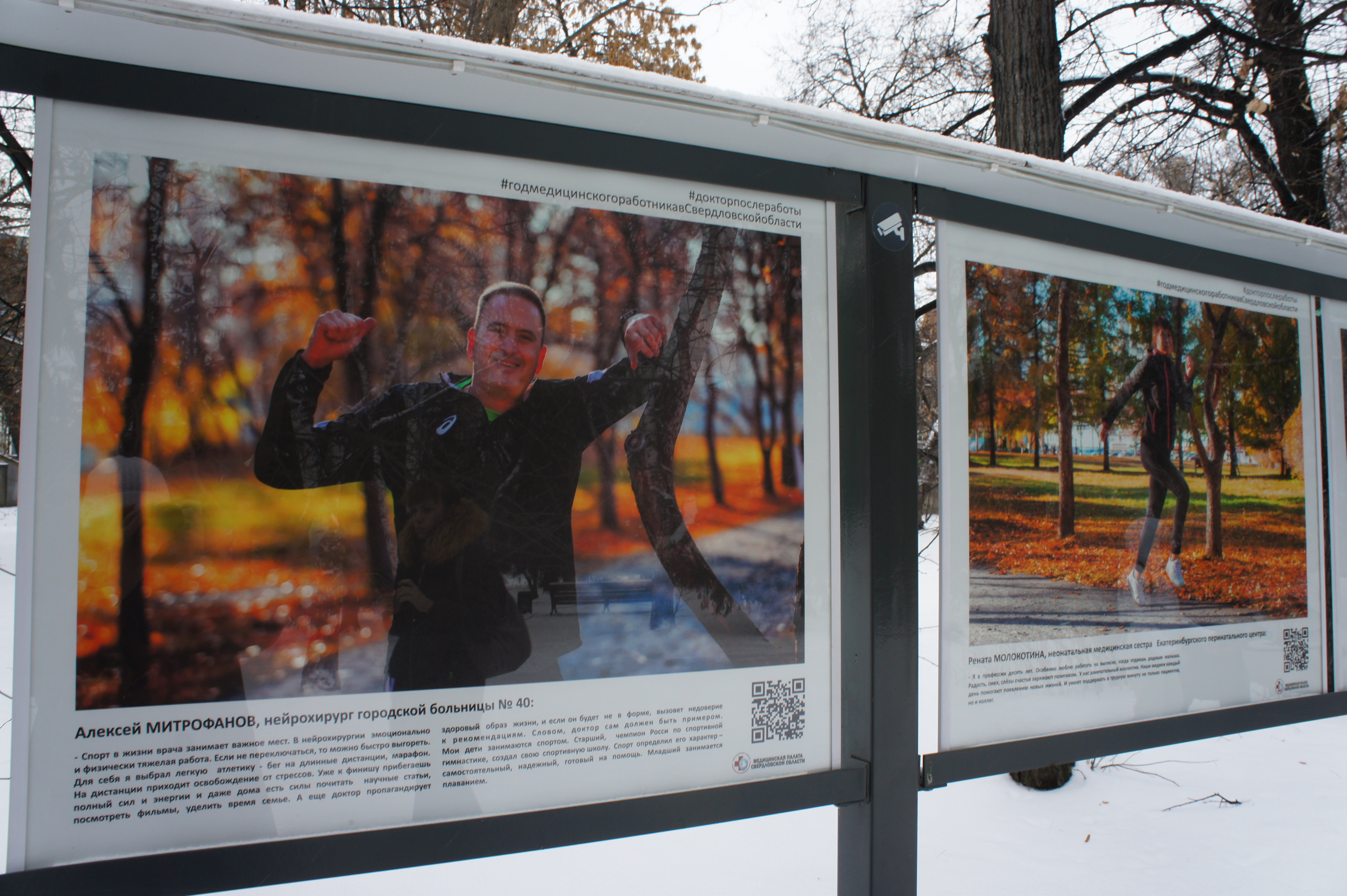 На 37 стендах - репортажные фотографии екатеринбургских медиков во время занятий их любимым хобби: поэзия, спорт, отдых на природе. Нашу больницу представляют хирург ГКБ 40 Евгений Тарасов и нейрохирурги Алексей Митрофанов и Александр Цицимушкин.